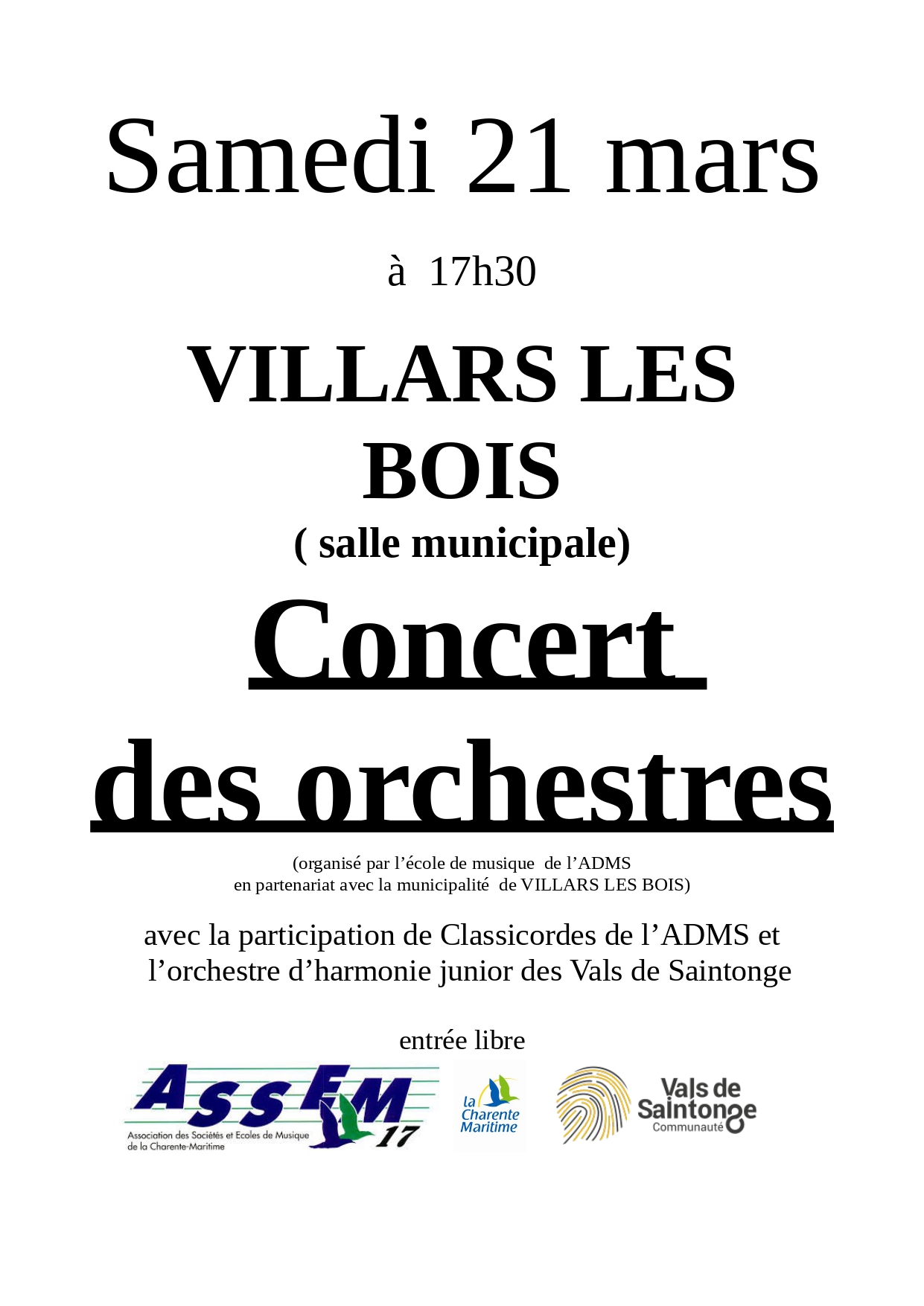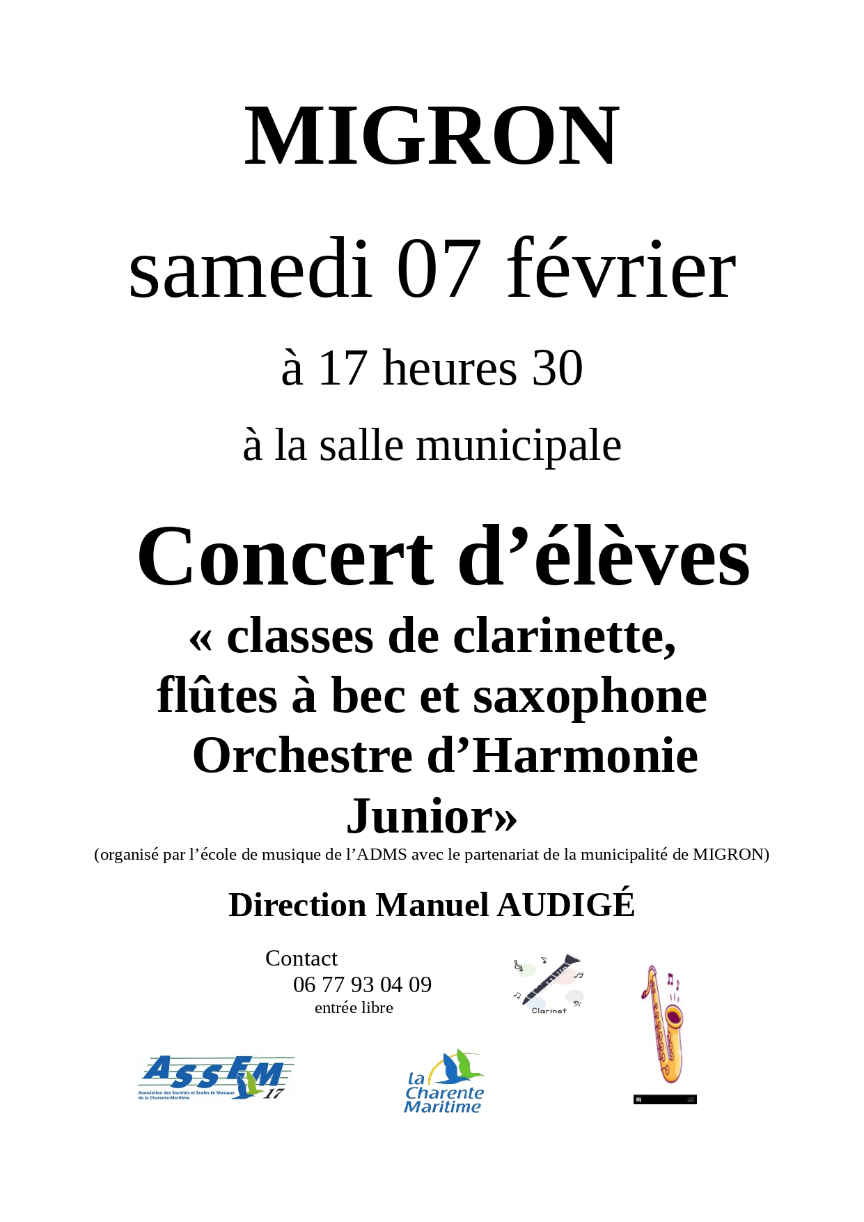 Concert d’élèves « petites formations classes de clarinette, saxophone, Choralacoustic et l’Orchestre Philharmonique Hilairois » (organisé par l’école de musique de l’ADMS en partenariat avec la municipalité de Brizambourg) Direction Manuel AUDIGÉ Contact 06 77 93 04 09 Entrée libre