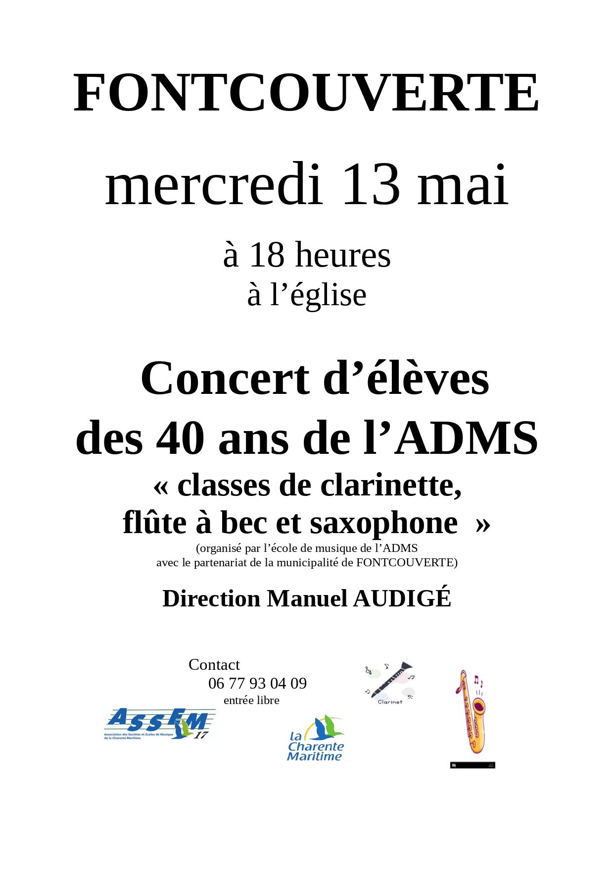 Concert d’élèves « petites formations classes de clarinette, saxophone, Choralacoustic et l’Orchestre Philharmonique Hilairois » (organisé par l’école de musique de l’ADMS en partenariat avec la municipalité de Brizambourg) Direction Manuel AUDIGÉ Contact 06 77 93 04 09 Entrée libre