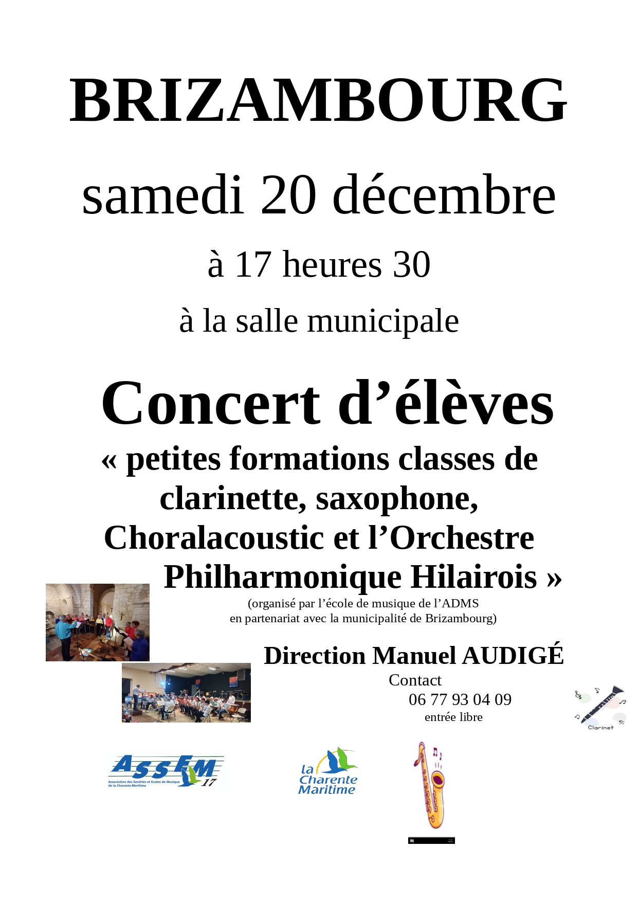 Concert d’élèves « petites formations classes de clarinette, saxophone, Choralacoustic et l’Orchestre Philharmonique Hilairois » (organisé par l’école de musique de l’ADMS en partenariat avec la municipalité de Brizambourg) Direction Manuel AUDIGÉ Contact 06 77 93 04 09 Entrée libre