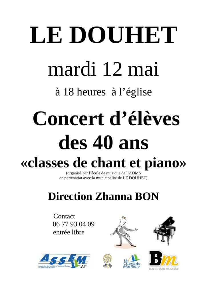 Concert d’élèves des 40 ans de l’ADMS « classes de chant et piano » Facebook Twitter LinkedIn Email Imprimer